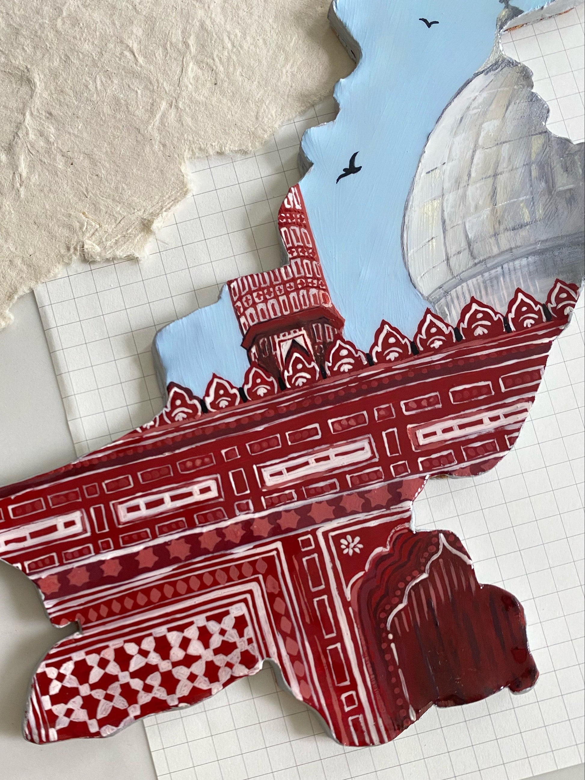 This handmade clay jewelry dish showcases a meticulously hand-painted design of the iconic Badshahi Mosque in Lahore, Pakistan. Ideal as a decorative piece or for storing rings, it brings a touch of cultural artistry and heritage to your space.